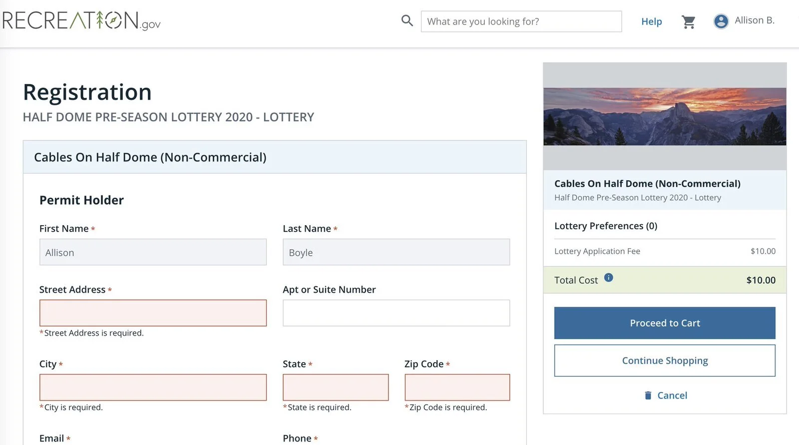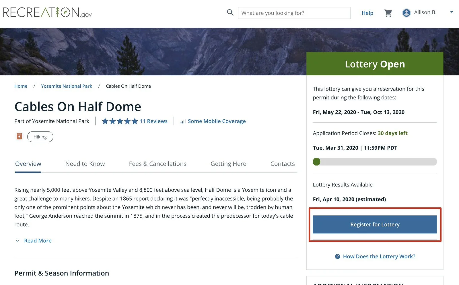 Step 2: When the Yosemite Half Dome lottery is open (March 1 - March 31), there will be a button that you can click to “Register for Lottery”.
